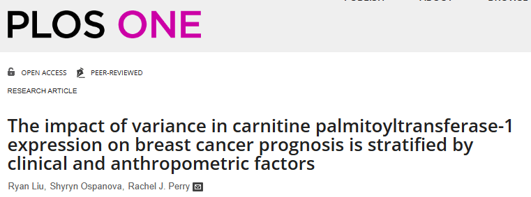 Congratulations Ryan! His paper demonstrating how the impact of CPT-1 expression on breast cancer prognosis depends on body composition and other clinical variables was published today in PLOS One. Ryan is the first high school student to publish a first author paper in the Perry lab; what a great achievement!